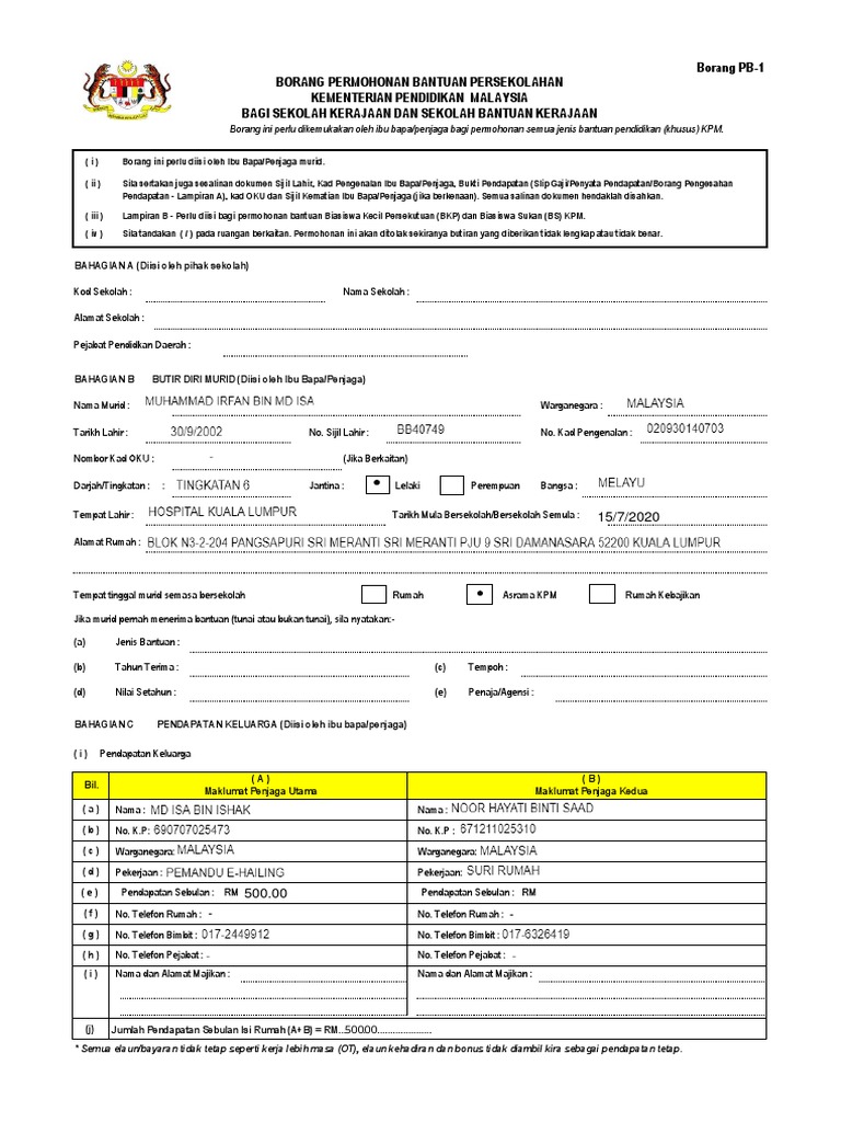 BANTUAN AWAL PERSEKOLAHAN 2022PERMOHONAN ONLINEBORANG UNTUK PELAJAR SEKOLAH RENDAH MENENGAH 2022DUIT BANTUAN. Baca versi flipbook dari Borang PB1 - BORANG. A Maklumat Penjaga Utama B Maklumat.